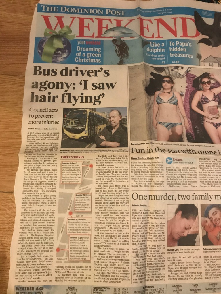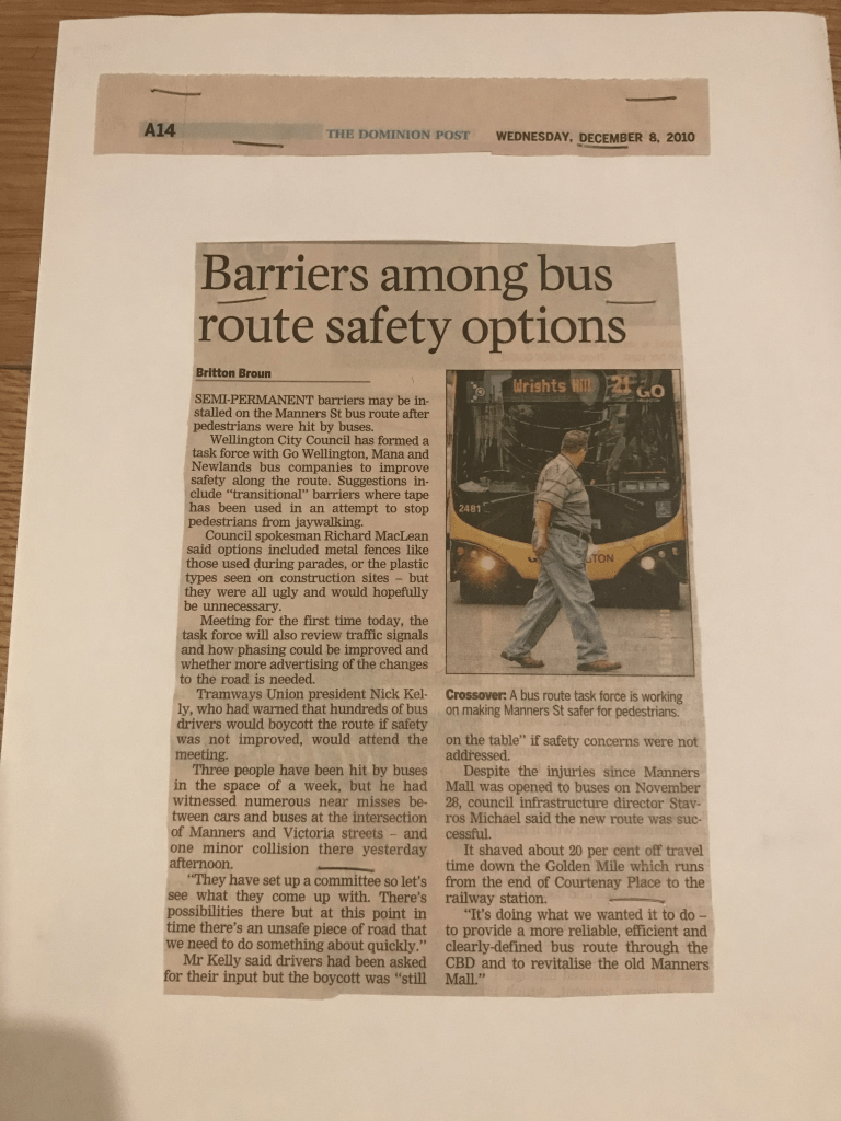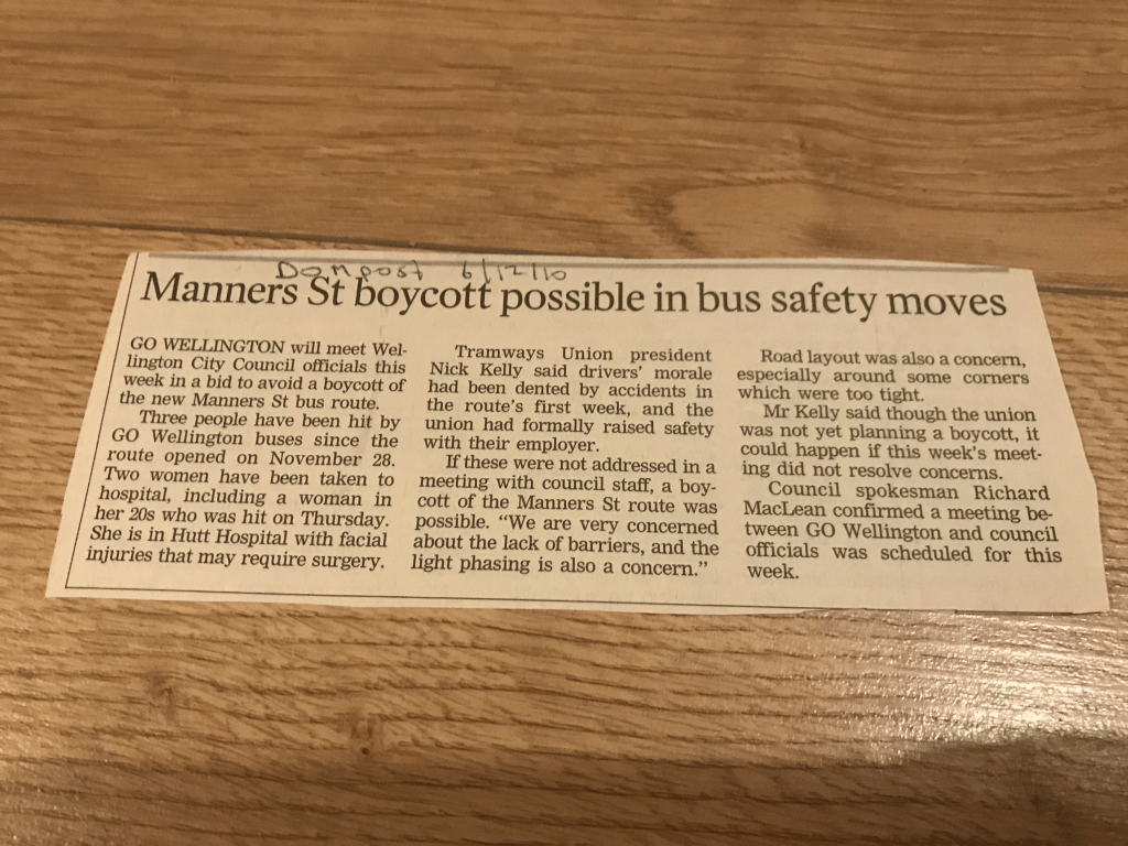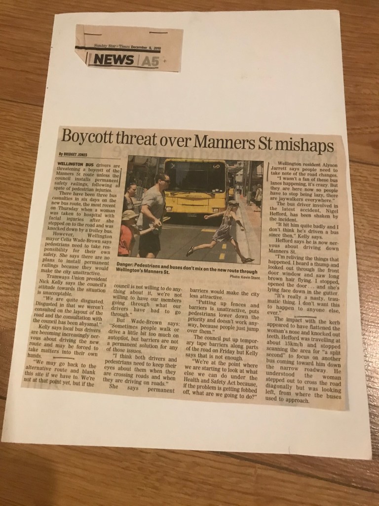 One of the major health and safety issues, aside from the design of the vehicle was the design of the city streets. In 2010 Wellington City turned a pedestrian Mall in Manners street into a main bus carriage through the city CBD. The city planners felt this shouldn’t create any major problems, especially as they lowered the speed limit to 20km per hour.